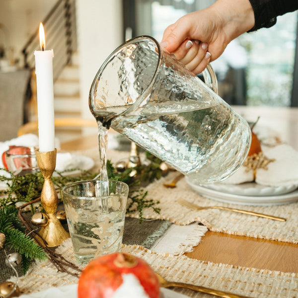 Beautifully handcrafted in India, the Montenegro Pitcher is handblown with hammered texture – the variations from the artisans’ touch bringing life and soul. Practical in size, it is great for serving iced water, juice or a delightfully fruity sangria, and multitasks when displaying fresh blooms. Each piece is unique and brings rich style to your table. Dishwasher Safe.